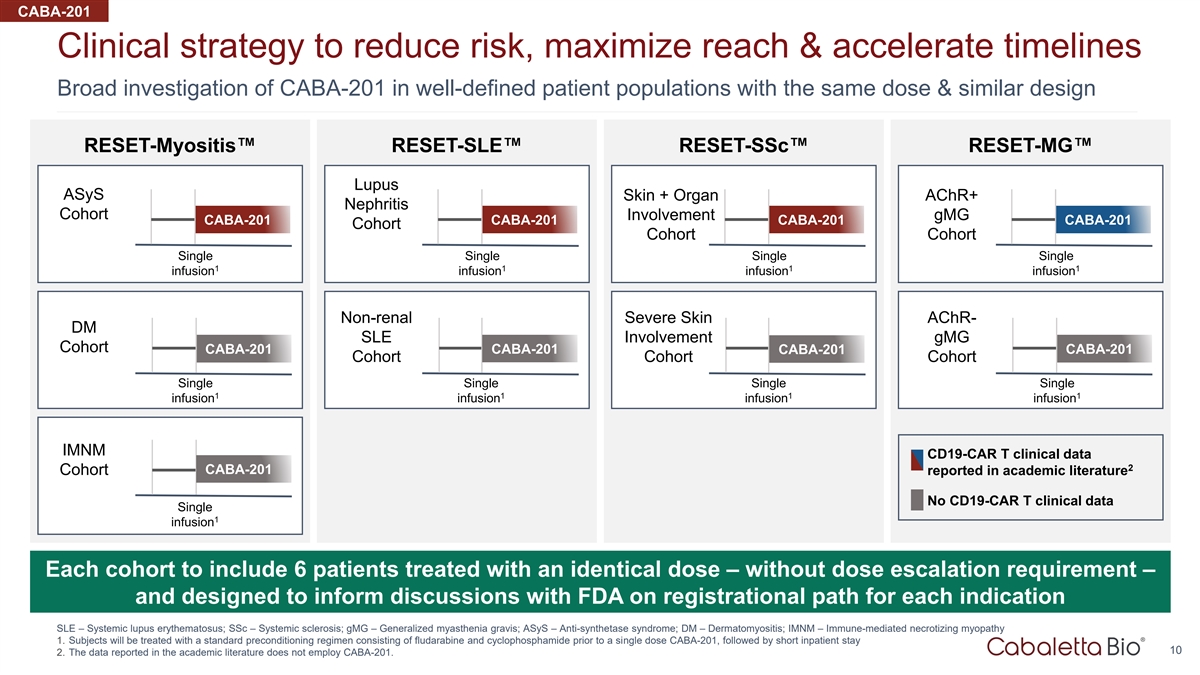 CABA-201 REstoring SElf-Tolerance (RESET™) Phase 1/2 trials advancing SLE & myositis trials currently recruiting, with a broadening portfolio to realize the potential of CABA-201 Phase 1/2 Trials Preclinical Rheum Myositis SLE SSc gMG 2024 Neuro Undiscl. > > > > Typical onset middle age Affects young women & Middle age onset common Bimodal age of onset people of color Autoimmune diseases Only FDA-approved Progressive skin & organ Profound weakness that in which B cells play a therapy is IVIg in DM ~40% with lupus nephritis, fibrosis with lung, cardiac, can be disabling key role which carries ~25% risk of renal damage High mortality due to lung Risk for myasthenic crises, death or ESRD within 10y & cardiac involvement Average survival of 12y with respiratory failure U.S. ~66k ~160-320k ~88k ~55k Over 1 million Prevalence Current therapies offer modest efficacy & often result in chronic and broad immunosuppression 9 SLE – Systemic lupus erythematosus; DM – Dermatomyositis; SSc – Systemic sclerosis; gMG – Generalized myasthenia gravis; ESRD – End-stage renal disease