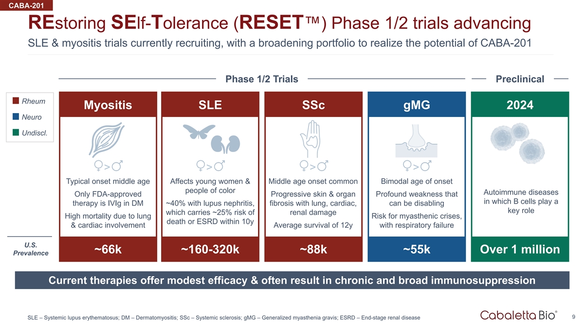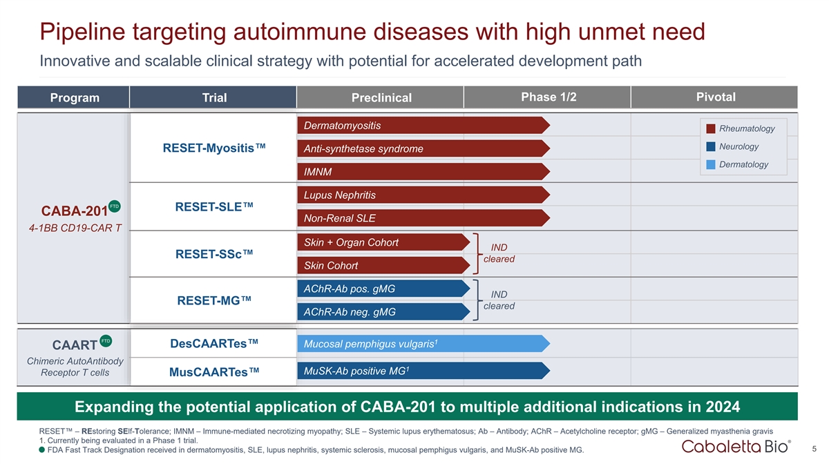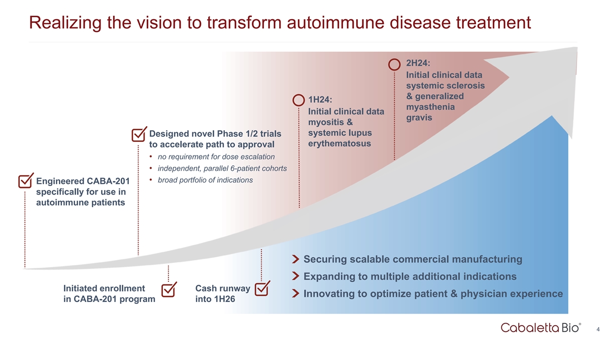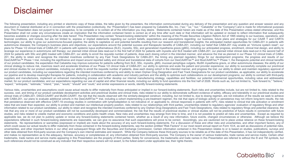 Disclaimer The following presentation, including any printed or electronic copy of these slides, the talks given by the presenters, the information communicated during any delivery of the presentation and any question and answer session and any document or material distributed at or in connection with the presentation (collectively, the “Presentation”) has been prepared by Cabaletta Bio, Inc. (“we,” “us,” “our,” “Cabaletta” or the “Company”) and is made for informational purposes only. This Presentation does not purport to be a prospectus, to be complete or to contain all of the information you may desire. Statements contained herein are made as of the date of this Presentation unless stated otherwise, and this Presentation shall not under any circumstances create an implication that the information contained herein is correct as of any time after such date or that information will be updated or revised to reflect information that subsequently becomes available or changes occurring after the date hereof. This Presentation may contain “forward-looking statements” within the meaning of the Private Securities Litigation Reform Act of 1995 relating to our business, operations, and financial conditions, and include, but are not limited to, express or implied statements regarding our current beliefs, expectations and assumptions regarding: our business, future plans and strategies for our CAAR T and CARTA technologies; our ability to grow our autoimmune-focused pipeline; the ability to capitalize on and potential benefits resulting from our research and translational insights; the anticipated market opportunities for CABA-201 in patients with autoimmune diseases; the Company’s business plans and objectives; our expectations around the potential success and therapeutic benefits of CABA-201, including our belief that CABA-201 may enable an “immune system reset”; our plans for Phase 1/2 clinical trials of CABA-201 in patients with systemic lupus erythematosus (SLE), myositis, SSc, and generalized myasthenia gravis (gMG), including our anticipated progress, enrollment, clinical trial design, and ability to leverage our experience in autoimmune cell therapy; our planned initial clinical data read-out in the first half of 2024 for patients with myositis and SLE treated with CABA-201; our planned initial clinical data read-out in the second half of 2024 for patients with SSc and gMG treated with CABA-201; our ability to enroll the requisite number of patients, dose each dosing cohort in the intended manner, and advance the trial as planned in our Phase 1/2 clinical trials of CABA- 201; the ability to retain and recognize the intended incentives conferred by any Fast Track Designations for CABA-201; the timing any planned regulatory filings for our development programs; the progress and results of our DesCAARTes™ Phase 1 trial, including the significance and impact around reported safety and clinical and translational data of cohorts from our DesCAARTes™ and MusCAARTes™ Phase 1; the therapeutic potential and clinical benefits of our product candidates; the expectation that Cabaletta may improve outcomes for patients suffering from SLE, SSc, myositis, gMG, mucosal pemphigus vulgaris, MuSK myasthenia gravis, or other autoimmune diseases; the ability of our clinical strategy to reduce risk, maximize reach and accelerate timelines of our Phase 1/2 clinical trials of CABA-201; our ability to optimize and scale the patient and provider experience; our ability to successfully complete our preclinical and clinical studies for our product candidates, including our ability to enroll the requisite number of patients, dose each dosing cohort in the intended manner, and progress the trial; our ability to obtain and maintain regulatory approval of our product candidates, including our expectations regarding the intended incentives conferred by and ability to retain Orphan Drug Designation and Fast Track Designations for our product candidates, as applicable; our ability to accelerate our pipeline and to develop meaningful therapies for patients, including in collaboration with academic and industry partners and the ability to optimize such collaborations on our development programs; our ability to contract with third-party suppliers and manufacturers, implement an enhanced manufacturing process and further develop our internal manufacturing strategy, capabilities and facilities; our potential commercial opportunities, including value and addressable market, for our product candidates; and our expectations regarding our use of capital and other financial results, including our ability to fund operations into the first half of 2026. Words such as, but not limited to, “look forward to,” “believe,” “expect,” “anticipate,” “estimate,” “intend,” “plan,” “would,” “should” and “could,” and similar expressions or words, identify forward-looking statements. Various risks, uncertainties and assumptions could cause actual results to differ materially from those anticipated or implied in our forward-looking statements. Such risks and uncertainties include, but are not limited to, risks related to the success, cost, and timing of our product candidate development activities and preclinical studies and clinical trials, risks related to our ability to demonstrate sufficient evidence of safety, efficacy and tolerability in our preclinical studies and clinical trials of CABA-201, DSG3-CAART and MuSK-CAART, the risk that the results observed with the similarly-designed construct, including, but not limited to, due to dosing regimen, are not indicative of the results we seek to achieve with CABA-201, our plans to evaluate additional cohorts in the DesCAARTes™ trial, including a cohort implementing a pre-treatment regimen, the risk that signs of biologic activity or persistence may not inform long-term results, the risk that persistence observed with effe