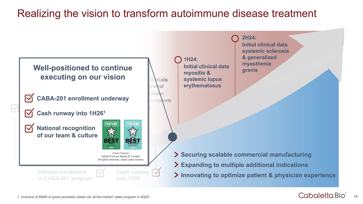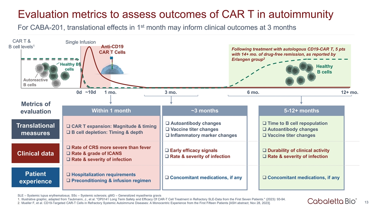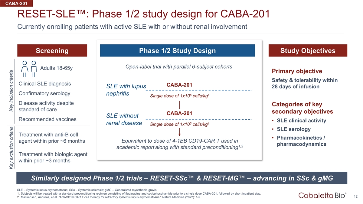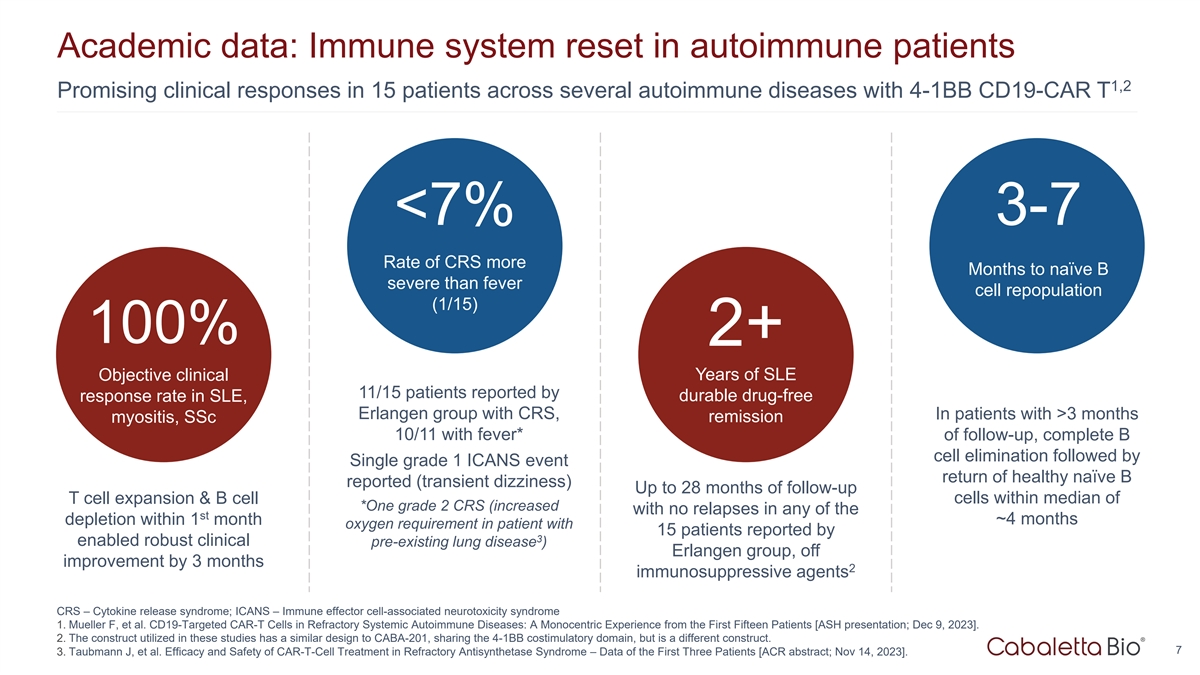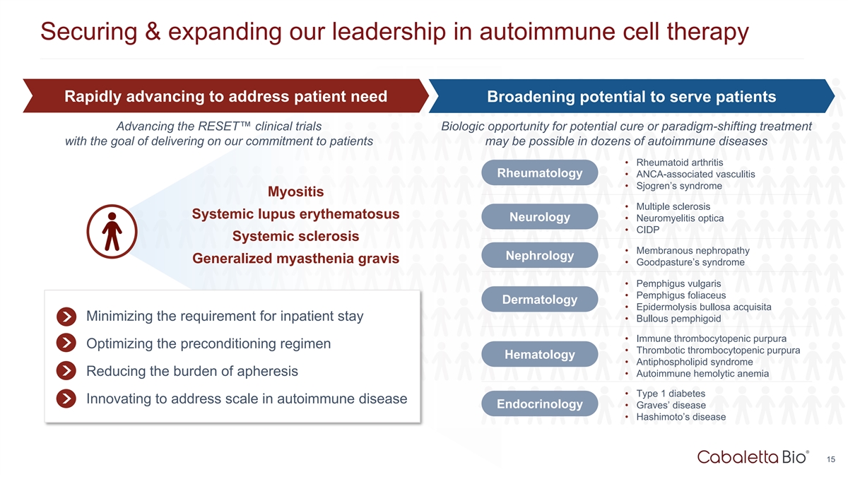 Disclaimer The following presentation, including any printed or electronic copy of these slides, the talks given by the presenters, the information communicated during any delivery of the presentation and any question and answer session and any document or material distributed at or in connection with the presentation (collectively, the “Presentation”) has been prepared by Cabaletta Bio, Inc. (“we,” “us,” “our,” “Cabaletta” or the “Company”) and is made for informational purposes only. This Presentation does not purport to be a prospectus, to be complete or to contain all of the information you may desire. Statements contained herein are made as of the date of this Presentation unless stated otherwise, and this Presentation shall not under any circumstances create an implication that the information contained herein is correct as of any time after such date or that information will be updated or revised to reflect information that subsequently becomes available or changes occurring after the date hereof. This Presentation may contain “forward-looking statements” within the meaning of the Private Securities Litigation Reform Act of 1995 relating to our business, operations, and financial conditions, and include, but are not limited to, express or implied statements regarding our current beliefs, expectations and assumptions regarding: our business, future plans and strategies for our CAAR T and CARTA technologies; our ability to grow our autoimmune-focused pipeline; the ability to capitalize on and potential benefits resulting from our research and translational insights; the anticipated market opportunities for CABA-201 in patients with autoimmune diseases; the Company’s business plans and objectives; our expectations around the potential success and therapeutic benefits of CABA-201, including our belief that CABA-201 may enable an “immune system reset”; our plans for Phase 1/2 clinical trials of CABA-201 in patients with systemic lupus erythematosus (SLE), myositis, SSc, and generalized myasthenia gravis (gMG), including our anticipated progress, enrollment, clinical trial design, and ability to leverage our experience in autoimmune cell therapy; our planned initial clinical data read-out in the first half of 2024 for patients with myositis and SLE treated with CABA-201; our planned initial clinical data read-out in the second half of 2024 for patients with SSc and gMG treated with CABA-201; our ability to enroll the requisite number of patients, dose each dosing cohort in the intended manner, and advance the trial as planned in our Phase 1/2 clinical trials of CABA- 201; the ability to retain and recognize the intended incentives conferred by any Fast Track Designations for CABA-201; the timing any planned regulatory filings for our development programs; the progress and results of our DesCAARTes™ Phase 1 trial, including the significance and impact around reported safety and clinical and translational data of cohorts from our DesCAARTes™ and MusCAARTes™ Phase 1; the therapeutic potential and clinical benefits of our product candidates; the expectation that Cabaletta may improve outcomes for patients suffering from SLE, SSc, myositis, gMG, mucosal pemphigus vulgaris, MuSK myasthenia gravis, or other autoimmune diseases; the ability of our clinical strategy to reduce risk, maximize reach and accelerate timelines of our Phase 1/2 clinical trials of CABA-201; our ability to optimize and scale the patient and provider experience; our ability to successfully complete our preclinical and clinical studies for our product candidates, including our ability to enroll the requisite number of patients, dose each dosing cohort in the intended manner, and progress the trial; our ability to obtain and maintain regulatory approval of our product candidates, including our expectations regarding the intended incentives conferred by and ability to retain Orphan Drug Designation and Fast Track Designations for our product candidates, as applicable; our ability to accelerate our pipeline and to develop meaningful therapies for patients, including in collaboration with academic and industry partners and the ability to optimize such collaborations on our development programs; our ability to contract with third-party suppliers and manufacturers, implement an enhanced manufacturing process and further develop our internal manufacturing strategy, capabilities and facilities; our potential commercial opportunities, including value and addressable market, for our product candidates; and our expectations regarding our use of capital and other financial results, including our ability to fund operations into the first half of 2026. Words such as, but not limited to, “look forward to,” “believe,” “expect,” “anticipate,” “estimate,” “intend,” “plan,” “would,” “should” and “could,” and similar expressions or words, identify forward-looking statements. Various risks, uncertainties and assumptions could cause actual results to differ materially from those anticipated or implied in our forward-looking statements. Such risks and uncertainties include, but are not limited to, risks related to the success, cost, and timing of our product candidate development activities and preclinical studies and clinical trials, risks related to our ability to demonstrate sufficient evidence of safety, efficacy and tolerability in our preclinical studies and clinical trials of CABA-201, DSG3-CAART and MuSK-CAART, the risk that the results observed with the similarly-designed construct, including, but not limited to, due to dosing regimen, are not indicative of the results we seek to achieve with CABA-201, our plans to evaluate additional cohorts in the DesCAARTes™ trial, including a cohort implementing a pre-treatment regimen, the risk that signs of biologic activity or persistence may not inform long-term results, the risk that persistence observed with effe