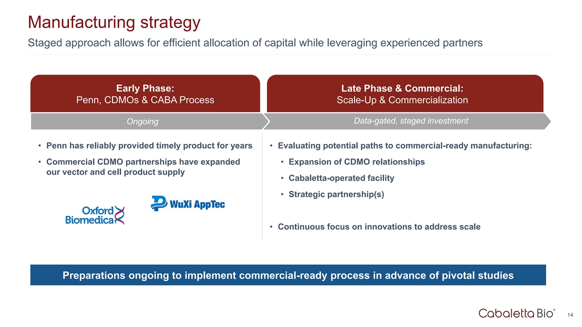 Manufacturing strategy Staged approach allows for efficient allocation of capital while leveraging experienced partners Early Phase: Late Phase & Commercial: Penn, CDMOs & CABA Process Scale-Up & Commercialization Data-gated, staged investment Ongoing • Penn has reliably provided timely product for years • Evaluating potential paths to commercial-ready manufacturing: • Commercial CDMO partnerships have expanded • Expansion of CDMO relationships our vector and cell product supply • Cabaletta-operated facility • Strategic partnership(s) • Continuous focus on innovations to address scale Preparations ongoing to implement commercial-ready process in advance of pivotal studies 14