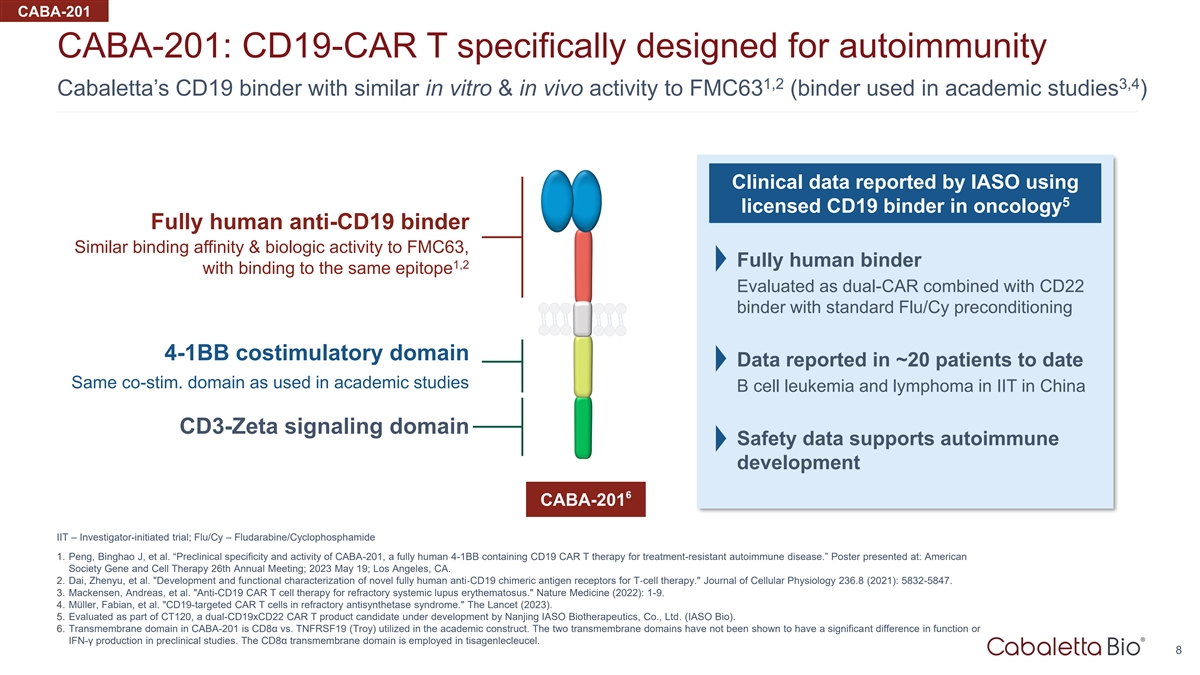 CABA-201 CABA-201: CD19-CAR T specifically designed for autoimmunity 1,2 3,4 Cabaletta’s CD19 binder with similar in vitro & in vivo activity to FMC63 (binder used in academic studies ) Clinical data reported by IASO using 5 licensed CD19 binder in oncology Fully human anti-CD19 binder Similar binding affinity & biologic activity to FMC63, Fully human binder 1,2 with binding to the same epitope Evaluated as dual-CAR combined with CD22 binder with standard Flu/Cy preconditioning 4-1BB costimulatory domain Data reported in ~20 patients to date Same co-stim. domain as used in academic studies B cell leukemia and lymphoma in IIT in China CD3-Zeta signaling domain Safety data supports autoimmune development 6 CABA-201 IIT – Investigator-initiated trial; Flu/Cy – Fludarabine/Cyclophosphamide 1. Peng, Binghao J, et al. “Preclinical specificity and activity of CABA-201, a fully human 4-1BB containing CD19 CAR T therapy for treatment-resistant autoimmune disease.” Poster presented at: American Society Gene and Cell Therapy 26th Annual Meeting; 2023 May 19; Los Angeles, CA. 2. Dai, Zhenyu, et al. Development and functional characterization of novel fully human anti‐CD19 chimeric antigen receptors for T‐cell therapy. Journal of Cellular Physiology 236.8 (2021): 5832-5847. 3. Mackensen, Andreas, et al. Anti-CD19 CAR T cell therapy for refractory systemic lupus erythematosus. Nature Medicine (2022): 1-9. 4. Müller, Fabian, et al. CD19-targeted CAR T cells in refractory antisynthetase syndrome. The Lancet (2023). 5. Evaluated as part of CT120, a dual-CD19xCD22 CAR T product candidate under development by Nanjing IASO Biotherapeutics, Co., Ltd. (IASO Bio). 6. Transmembrane domain in CABA-201 is CD8α vs. TNFRSF19 (Troy) utilized in the academic construct. The two transmembrane domains have not been shown to have a significant difference in function or IFN-γ production in preclinical studies. The CD8α transmembrane domain is employed in tisagenlecleucel. 8
